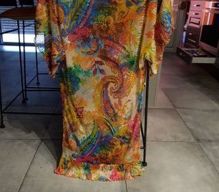 Écharpe en tissu multicolore avec motifs à pois. Les couleurs principales sont le vert, le rouge et le beige, disposées en bandes horizontales. Etat neuf, à étrenner