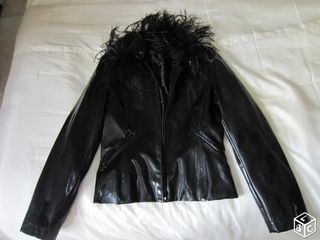 VESTE VINYLE NOIRE TAILLE 38 AVEC FOURRURE PLUME NOIR TRES BON ETAT CAR TRES PEU PORTEE POCHES ZIP DEVANT
