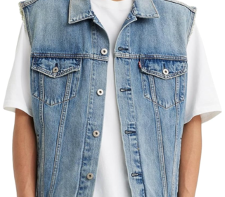Veste sans manches en jean de couleur bleue claire. Dispose de deux poches à rabat sur la poitrine et d'une fermeture à boutons. Jamais porté..