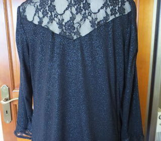 gilet taille 1 (38-40)P Bréal, maille pailleté avec empiècements dentelle sur le haut du gilet et sur le bas des manches, petite couture élastiquée au milieu col dans le dos et hau
