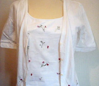 Ensemble blanc petites fleurs"rouges" rebrodées en relief. Débardeur(doublé poitrine) à porter seul ou sous son petit gilet assorti. Un ensemble très actuel et idéal pour les soi