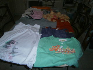 une dizaine de T Shirts 12 ans un vert manches courtes un orange manches courtes un débardeur rouge un chemise à carreaux orange/rouge un débardeur violet à rayures un débardeur br