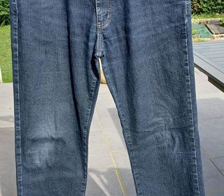 Jean "WAMPUM" avec passant pour ceinture. En très bon état, excepté le bas de chaque jambière légèrement usé cause frottements. Couleur : bleu marine. Taille 44. 85 % coton ? 1