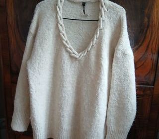 Beau pull épais et léger, grand col en V torsadé ton beige/écru, ne pique pas, très doux.