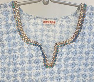 Robe/ Tunique Bleue et blanche avec sequins T M Marque Cotton Plus Manches 3/4 Fendue de chaque côté (39 cm) Taille M Epaule à épaule : 40,5 cm Aisselle à aisselle : 51 cm