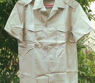 Chemisette d'uniforme beige taille 39, 2 poches poitrine à soufflet et rabat boutonné, 2 épaulettes, col tailleur, bas droit, manches courtes à revers, 65% polyester, 35% coton. C