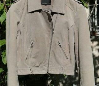 Perfecto Vero Moda beige taille 42, croûte de cuir. Mesures en cm : longueur de la manche (à partir de la couture de l'épaule, jusqu'à l'extrémité du poignet) 65.5, du plus haut j