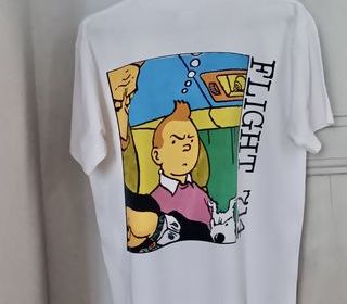 authentique et rare :T- shirt des années 90 "unisex" TINTIN " VOL 714 " 100% coton ; très bon état , jamais porté taille: L ( voir photo ) ; hauteur 69cm x L 53 cm prix: 30 € +