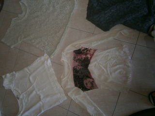 - un pull tissus sweat blanc avec pois gris - un débardeur laine beige - un T Shirt manches longues blanc un débadeur noir imprimé 5 euros le tout