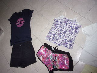 un short jean bleu clair un short jean noir un short jean jaune/vert un T Shirt marine adidas un débardeur bretelle fleurs mauve un T shirt blanc imprimé un short noir et ros