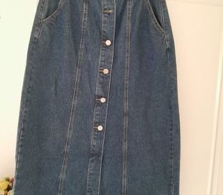 Jupe longue en jean , boutonnée sur le devant par boutons argent, 2 poches devant. Taille 42. Etat neuf. Tel.