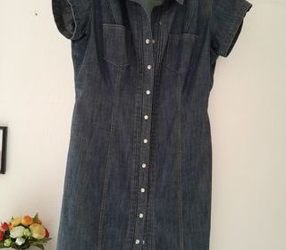 Robe en jean fermée devant par boutons pression, petites manches courtes. Poches poitrine.. col chemise . Taille 42. Etat neuf. Tel