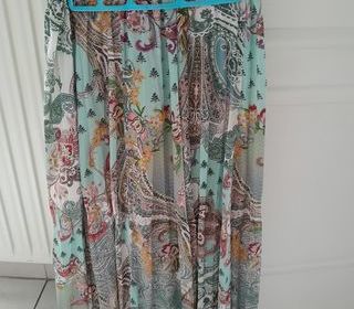 Jupe longue imprimée, couleur bleu clair à fleurs. taille élastiquée. Taille 42. état neuf. Tel.