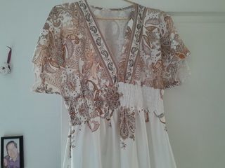 Robe longue, polyester ,blanc cassé avec imprimé corsage et bas de robe. Neuve, jamais portée.