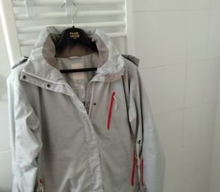 Excellent état, peu oortée waterproof et windproof Gris clair flammé gris foncé Doublure chaude polyester Capuche amovible 4 poches extérieures zippées bordées de rouge 1 poc