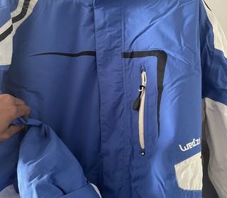 veste de ski homme taille XXL, très peu portée. bleu et blanc, avec capuche. Très nombreuses poches intérieures et extérieures Resserage par élastique et attache bouton en bas