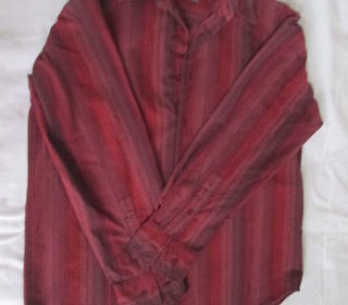 Chemise homme à manches longues. Couleur rouge brique à rayures. Très peu portée. Marque JULES, taille M. Fermée par des boutons. Poigné fermé par 2 boutons. Longueur 75 cm ? Large