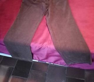 Vends pantalon en velours marron foncé taille 44 avec fermeture éclair, 80% coton , 18% polyamide, 2% élasthanne, longueur de jambe 72 cm, longueur totale 86 cm , 2 poches devant,