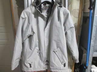 Parka d'hiver, blanc cassé, notée taille S mais correspond plutôt à une taille M/L. La veste a une capuche qui s'enlève à l'aide d'un zip. Deux poches latérales, deux poches intéri