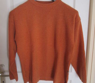 Pull femme, couleur orange, noté taille L . Marque Fleur de Sel. 65% laine, 25% acrylique, 10% polyamide. Peluché par endroits. Longueur au dos 60 cm, largeur sous les bras 53 c