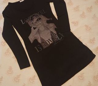 Robe noir en jersey doux, motif uniquement a l'avant, écriture " Loft girl " les L sont en brillants et plus bas " is lovely" longueur 84cm, taille 2 = 38/40