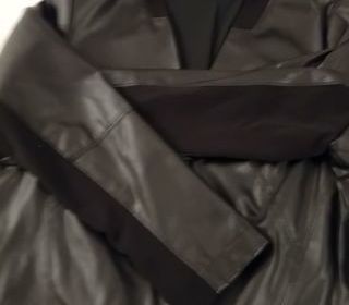 Veste bleu clair portée très peu avec une fermeture à tirette et une ceinture. Des poches de côtées.
