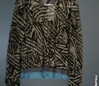 Joli Haut Blouse en voile transparent imprimé Dominance beige et noir avec liseré turquoise à la base et aux manches + son débardeur turquoise bretelles spaguettis Taille 38/4