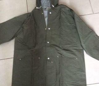 veste et pantalon de pluie en PVC bonne qualité fermeture de la veste par boutons pression bas de pantalon réglable par boutons couleur verte le pantalon un peu plus foncé que l