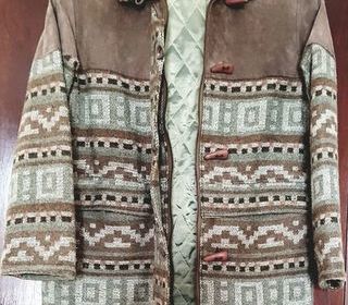 Manteau taille 38/40. Marque : "Comptoirs Méditerranéens des Cuirs" Motifs géomètriques vert amande et marron, avec empiècement croûte de cuir Doublure matelassée vert amande C