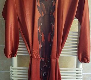 Ensemble 2 pièces en satin : - Tunique longue (90cm), fendue sur les côtés, avec un masque africain peint à la main Peut se porter droite ou avec une ceinture - Pantalon (105cm