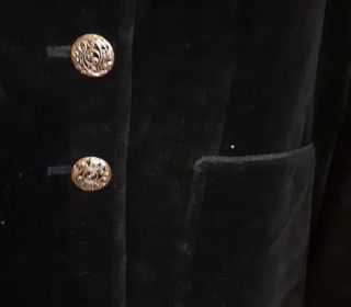 Ensemble femme en velours lisse, jupe droite, bouton à la taille dos, veste droite, boutons fantaisie dorés, poignés revers en triangle avec 3 boutons fantaisie dorés, marque CLAUD