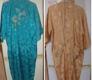 kimono, robes de chambre, tenues d'intérieur longues, avec ceintures et poches devant, brodés, neufs (fond de magasin ayant fermé), 54% rayonne, 46% fibranne, 10 € pièce : - bleu
