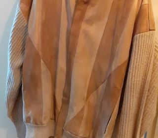 Beau blouson T.5, dos et manches tricot mohair devant daim avec découpes fantaisie beige et marron clair, fermeture éclair sur cuit,2 poches. Marque Paul Foueticq, made in France