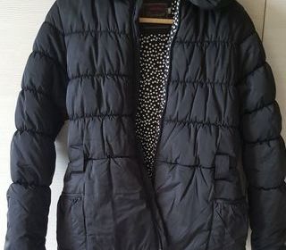 Doudoune noire pour fille taille 14 ans. Confortable et tenant chaud, avec poche extérieure de chaque côté et capuche cachée.
