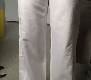 Vends pantalon large blanc Taille 36 Lien de serrage à la cheville permettant de le porter différemment Fermeture par fermeture éclair et 2 boutons Passants de ceinture 2 poch