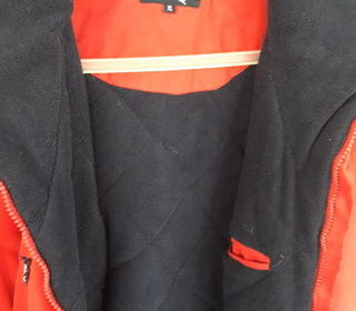 ANNORAK ROUGE AVEC FERMETURE ECLAIR DOUBLURE POLAIRE ET MATELASSEE BLEU MARINE TRES CHAUD 2 POCHES CÔTé FACE EN HAUT AVEC FERMETURE IDEM EN BAS BAS DES MANCHES A SCRATCH A L INTE