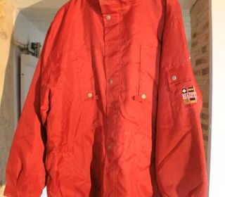Veste homme pour la pluie avec capuche qui se replie dans le col Taille XL 5 en polyamide et polyester . Cette veste est doublée , Elle a 6 poches . Sa couleur est rouge ,orangée