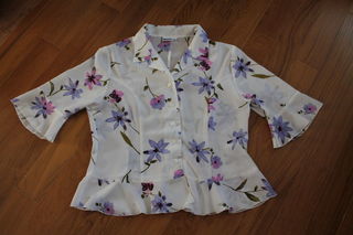 VENDS CHEMISIER A FLEURS MAUVES TAILLE 46/48 FERME DEVANT PAR BOUTON PINCES DEVANT MANCHES 3/4 VOLANT AUX BAS DES MANCHES ET A LA BASE 100 % POLYESTER PRIX 8 €