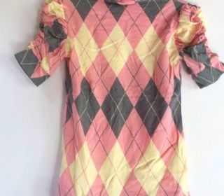 TEE-SHIRT A LOSANGES JAUNES, ROSES ET GRIS FONCE MANCHES COURTES BOUFFANTES PETIT COL MONTANT 100% coton Taille unique largeur épaules : 32 cm longueur : 54 cm Prix : 3