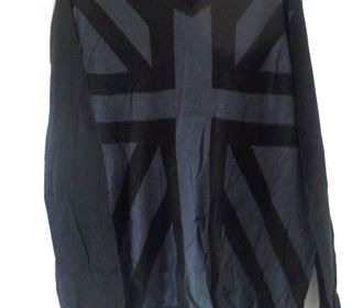 PULL HOMME "DESIGN BY S.L." XL Col en V Devant bleu et noir - motifs géométriques Dos noir uni 60% viscose/40% coton Merci de vous référer aux mesures ci-dessous Encolure :