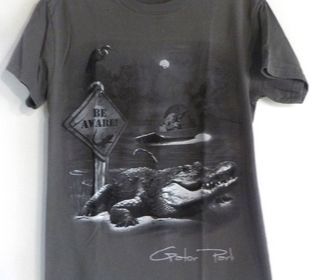 TEE-SHIRT "GATORPARK" décor parc d'alligator avec alligator et hydroglisseur PLUS D'ETIQUETTE donc pas de taille formelle Merci de vous référer aux mesures ci-dessous Large