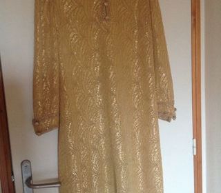 ROBE GRANDE TAILLE DORÉE BRODÉE EN TRES BON ETAT DIMENSIONS (VOIR PHOTO 2) : ÉPAULE À ÉPAULE 43 cm AISSELLE À AISSELLE 56 cm HAUTEUR 103/105 cm LARGEUR 71 cm POUR LE RÈ