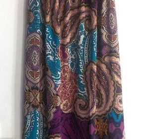 ROBE LONGUE BUSTIER NEW LOOK Taille 36 fendue sur les 2 côtés sur 58 cm en partant du bas multicolore : mauve, bleu, jaune, orange, etc 95% polyester 5% elastane Largeur bust