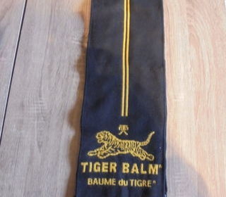 Très jolie écharpe, de la marque originale "Tiger Balm", de couleur noire avec inscriptions jaunes, dos uni, terminaisons frangées, en 100 % acrylique, fabrication française,