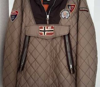 Manteau a capuche de marque Napapijri, de couleur kaki, de taille L et dans un très bon état. Le manteau s'enfile par le dessous, comme un pull (brayette sur le côté du manteau pou