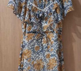 Robe de marque Promod, de couleurs bleu (motifs), crème (doublure) et orangé (fleurs). De taille 38 et dans un bon état. Il y a des volants sur le haut de la robe situés au niveau