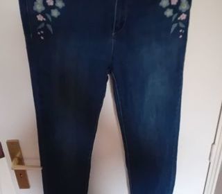 JEAN FEMME COULEUR BLEU MARINE TAILLE 38 2 POCHES EN BIAIS SUR DEVANT 2 POCHES ARRIERE PLAQUEES BRODE DE CHAQUE COTE EN HAUT SUR DEVANT LARGEUR TAILLE 38 CM HAUTEUR 93 CM ENTR