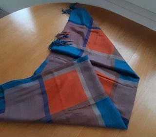 Foulard à carreaux couleur bleu canard, rouille, neuf. 45 % viscose, 55% acrylique longueur : 1m73 largeur : 70 cm