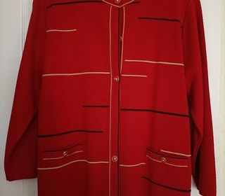Ensemble lainage rouge. Veste boutonnée, jupe droite élastiquée. Marque C et A