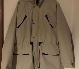 Jolie parka blanc cassé chaudement doublée. Taille XL. Fermeture zippée + patte de fermeture par boutons pression. Capuche imperméable cachée dans le col. Taille et bas de manch